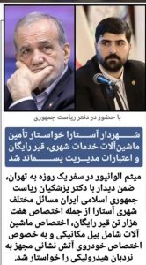 میثم الوانپور در سفر یک روزه به تهران ضمن دیدار با دکتر پزشکیان ریاست جمهوری اسلامی ایران مسائل مختلف شهری آستارا از جمله اختصاص هفت هزار تن قیر رایگان اختصاص ماشین آلات شامل بیل مکانیکی و به خصوص اختصاص خودروی آتش نشانی مجهز به نردبان هیدرولیکی را خواستار شد